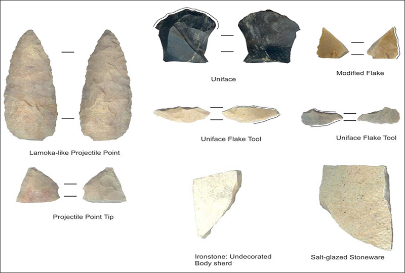 The earliest clear evidence for Native American utilization of the Midwest is represented in the Paleoindian Period (about 10,000 to 8000 B.C.). This period was marked by the retreat of the last glaciers and was characterized by a warming climate and the development of hardwood forests. During this time, small groups lived on the landscape in a highly mobile fashion; it is estimated that the entire State of Ohio likely housed less than 700 people at this time (Seeman 1994). Although most of Ohio’s studied Paleoindian Period sites are located in the state’s northeast quadrant, the Sandy Springs site is situated on the Ohio River near the confluence of the Scioto River. Sandy Springs is a large site whose occupants crafted the time period’s distinctive lanceolate and fluted lanceolate shaped projectile points during repeated visits over a time span of approximately 1500 years (Cunningham 1973; Seeman et al. 1994).
