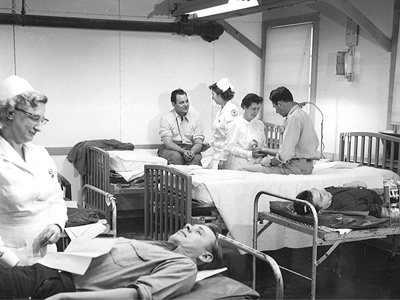 J.A. Kemp, Don Petit and Lucile Stanley treat patients in the treatment room of the X-101. (March 12, 1954)