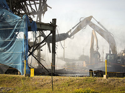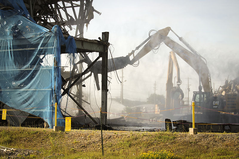 Aerial view of the X-326 from the southeast corner as demolition continues, crews are also pictured simultaneously loading debris on September 8, 2021