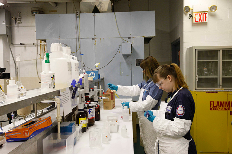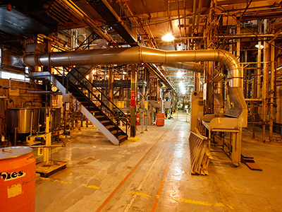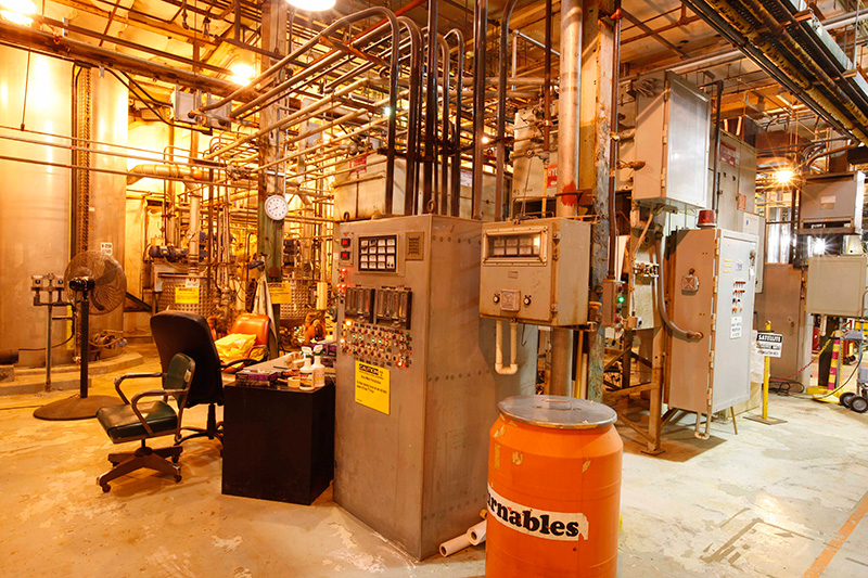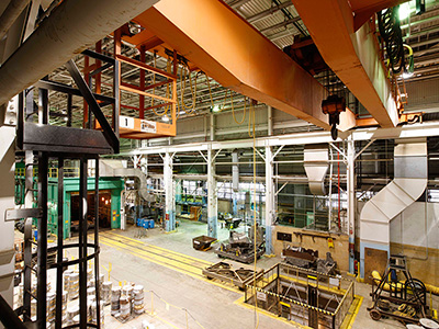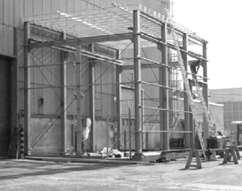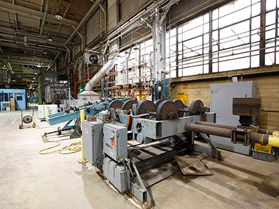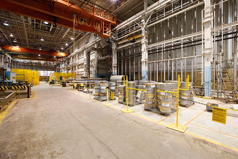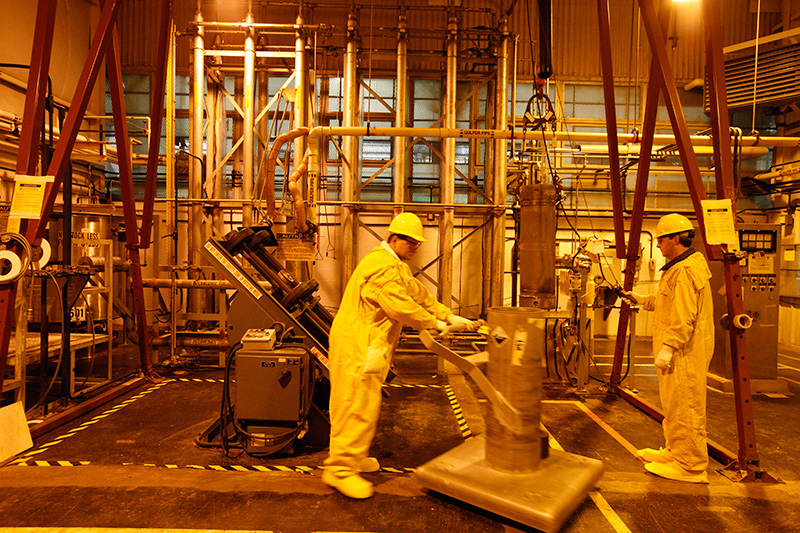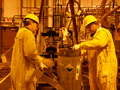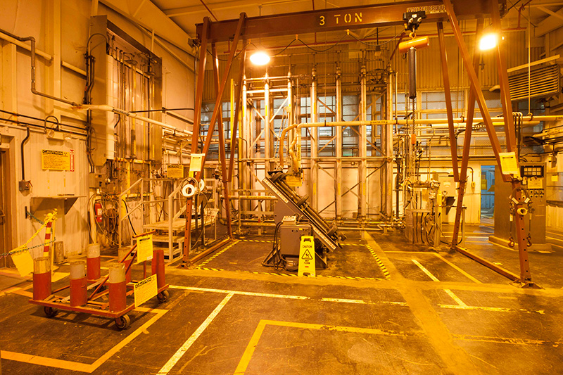 West Annex Small Cylinder Decontamination and Blending & Batching Area. Operators positioning a cylinder for decontamination